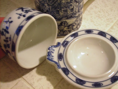 I was going to say butter until I saw it with the mug. I really don't know unless it was for individual butter pats? The more I visit your site (which is almost every day), the more I like your new home. I love blue and it just seems so homey and restful.